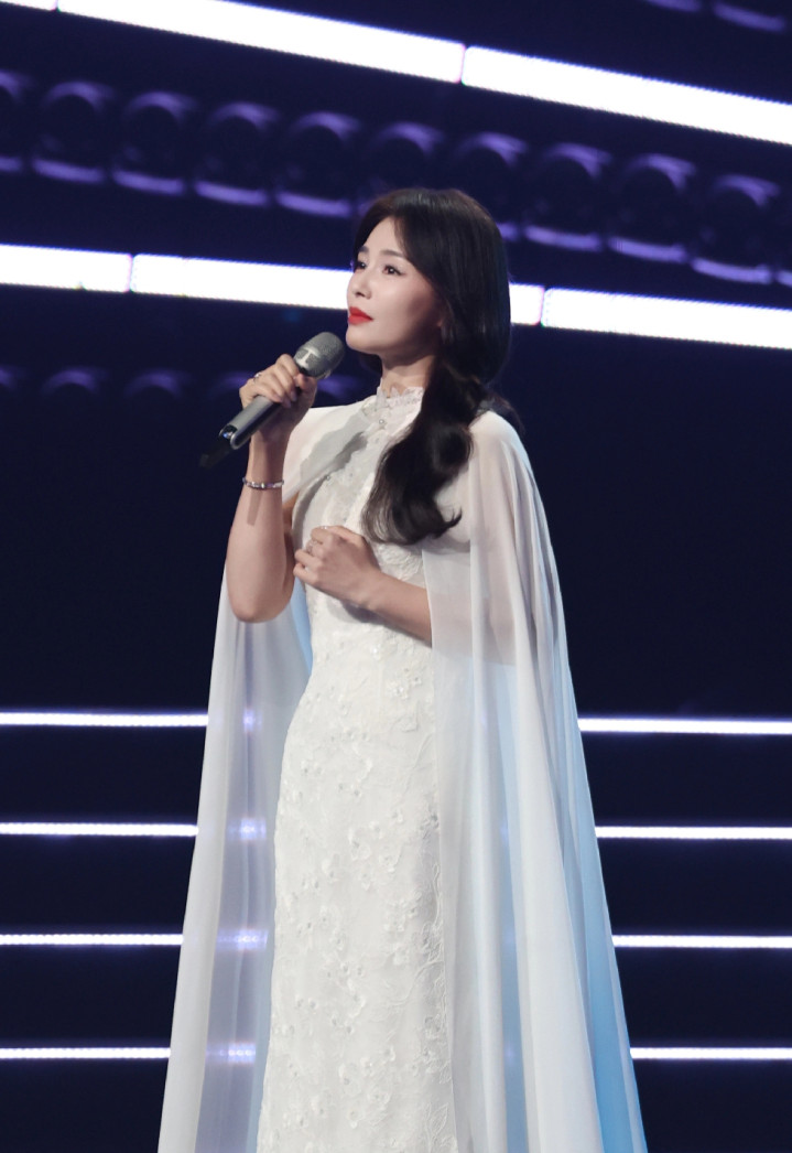 47岁刘涛献唱湾区升明月晚会, 身穿白色带披肩长裙, 雍容华贵